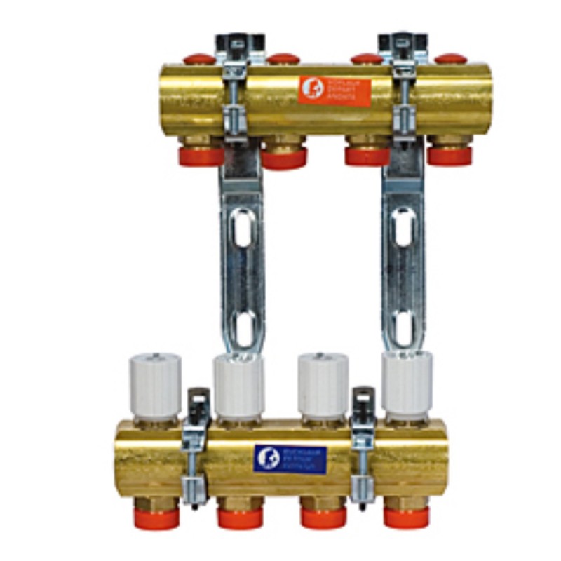 Distribuitor-colector preasamblat din alamă Giacomini pentru instalaţii de încălzire cu şase circuite.