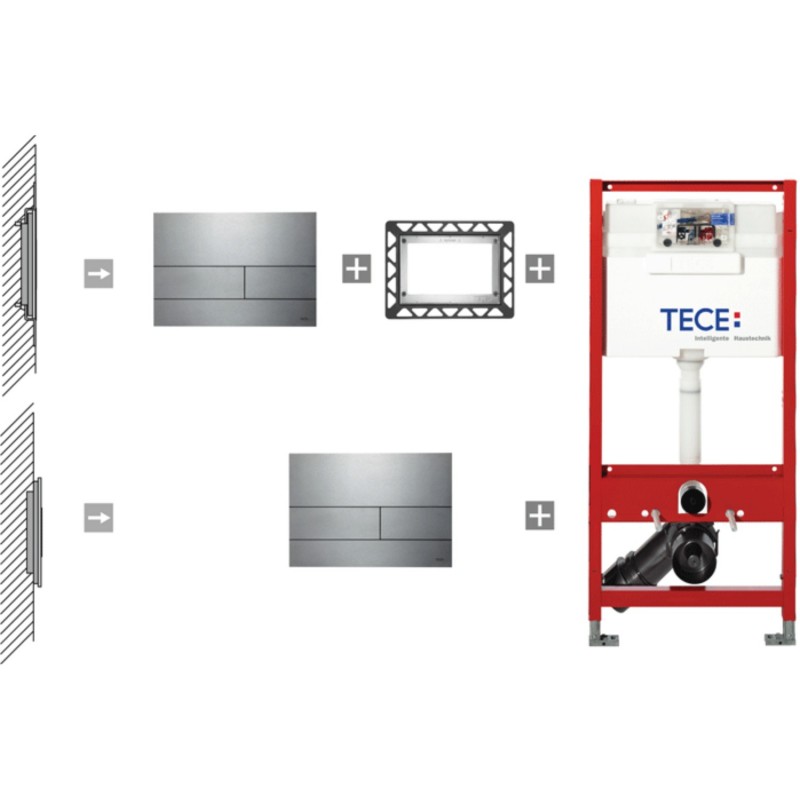 Ansamblu TECEsquare, avand rama şi cele două butoane realizate din oţel inox finisaj mat, protejat anti- abraziv şi anti- amprentă.