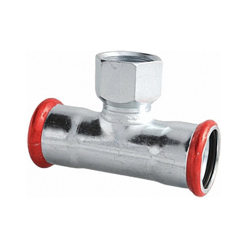 Teu redus cu filet interior 22-3/4" int.-22 mm, prin presare, utilizată pentru realizarea sistemelor de încălzire, răcire, solar, aer comprimat, sisteme de stins incendii din oţel carbon galvanizat.